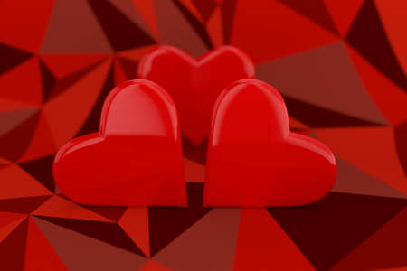 three red hearts on a low poly red background, 3d illustration
