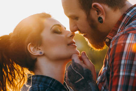 Romantic relationship. Gentle love harmony. Happy red haired hipster couple kissing on sunset.