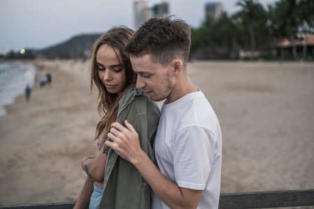 Couple in love. Young man embraces a woman wrapped in plaid on background of sea, tranquil scene