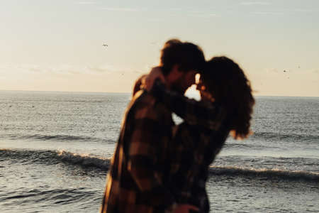Silhouette of blurred woman and man hugging with sea on the background, young couple fall in love, focus on waves