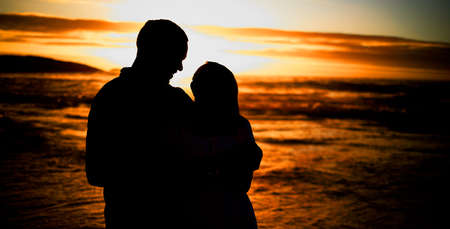 Silhouette affectionate young couple sharing an intimate moment on the beach. Backlit happy husband and wife enjoying a summer day by the sea. They love spending time together on the coast at sunset