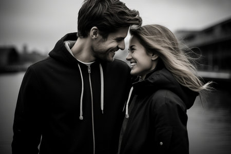 black and white close-up portrait of young couple in love, guy and a teenage girl, against the backdrop of the setting sun. long-awaited meeting, enjoying the moment, tender feelings. Valentine's Day