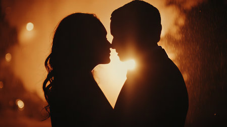 Silhouetted couple man and woman stands close in dramatic backlight, foreheads nearly touching. A moody, intimate moment of love, connection, and emotion captured in soft shadow and glow.