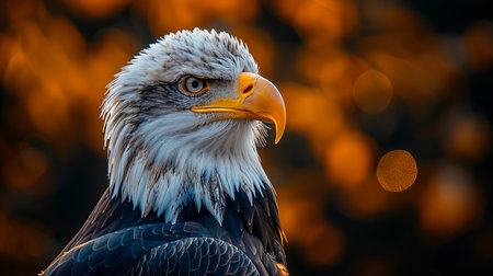 Majestic bald eagle at sunset with impressive plumage and intense gaze.