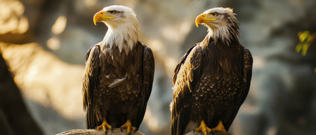 Two bald eagles sit on rocks showcasing their majestic feathers and sharp beaks in a serene natural setting during daylight.