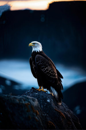Bald eagle is standing on a rocky outcrop, its white head and yellow beak contrasting against the dark, blurred background