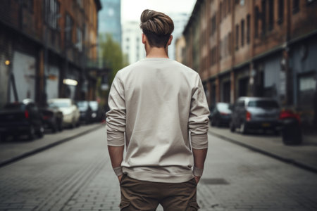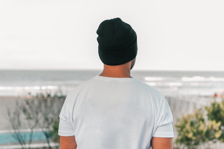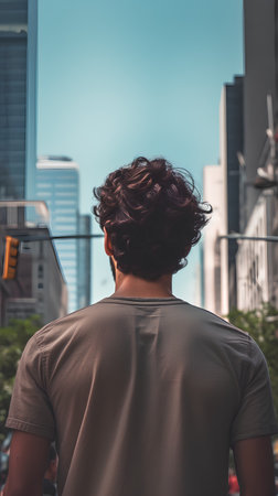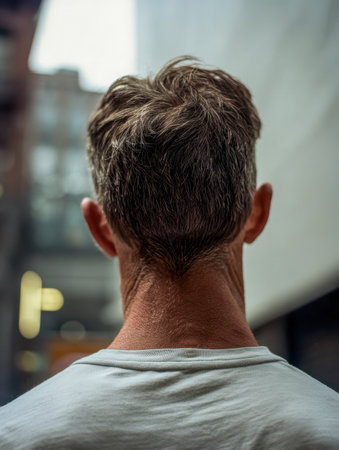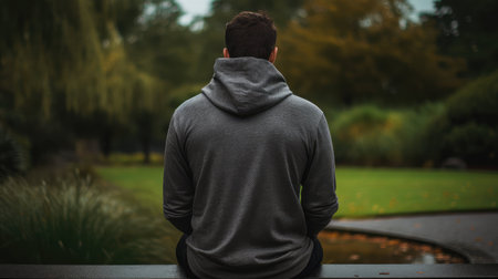 A young man is captured from the back in a casual outdoor setting, showcasing his short hair and a moment of deep thought. The serene atmosphere enhances the feeling of reflection.