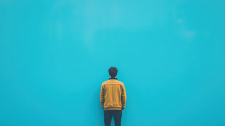 A person in a yellow jacket stands still facing a vibrant blue wall creating a striking contrast in an urban setting during daylight.