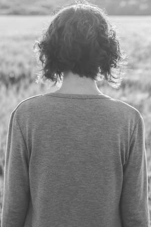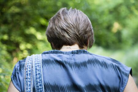 Rear view of a woman with brown hair in a leather jacket looking away in the park – Girl with short hair standing still and relaxed in nature – concept image for hope and optimism