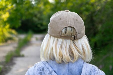 A person is seen from behind, wearing a casual outfit consisting of a white baseball cap and a grey hooded sweatshirt, with a backpack visible.