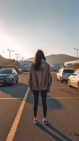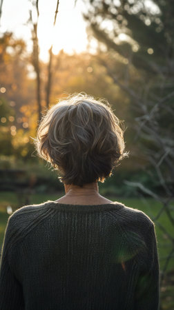 A serene back view of a woman walking along a vibrant path illuminated by warm sunlight, symbolizing tranquility and freedom.