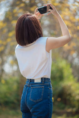 An Asian tourist woman relaxes and takes a photo in the beautiful blooming yellow flower tree tunnel. Travel and Lifestyle Concept.