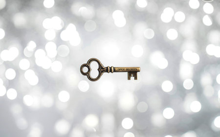 An intricately crafted vintage key poised to open a hidden passage, casting a soft glow that hints at secrets waiting beyond the threshold.