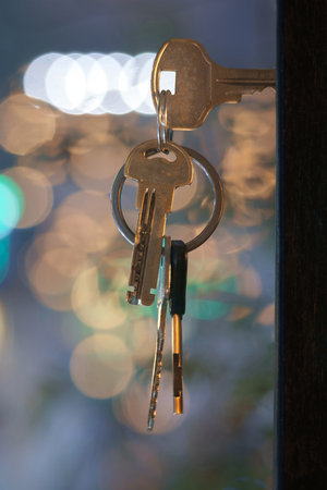 The keys with house keyring in the door keyhole with blurred night lights background, selective focus