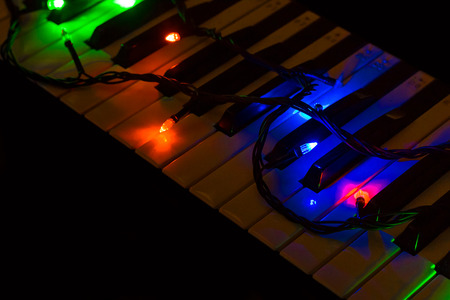 Multicolored lights of a garland on the piano on a dark background