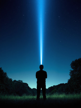 A man with his back turned and projecting a flashlight into the night sky. On both sides are trees and grassland, The sky is full of stars, AI Generated.