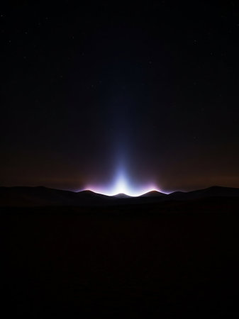 A single, bright beam of ethereal light rises from the horizon, illuminating the tops of dark, silhouetted mountains against a star-filled night sky.