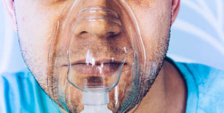 The bearded man has an oxygen mask on his face. Close-up. The patient has trouble breathing. Close up.