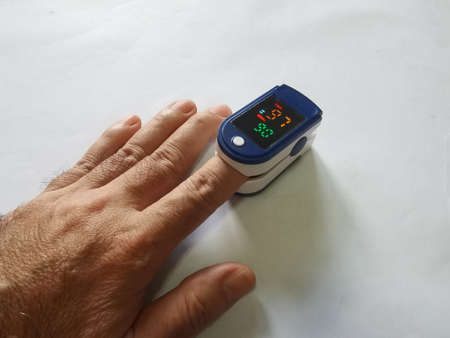 man using pulse oximeter device on finger,Oxygen Saturation Monitor use light pass through the blood in finger measuring amount of oxygen,healthcare concept,