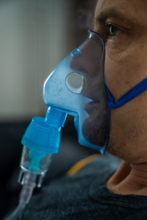 Close up view of unhealthy man wearing nebulizer mask in home. Health, medical equipment and people concept. High quality photo