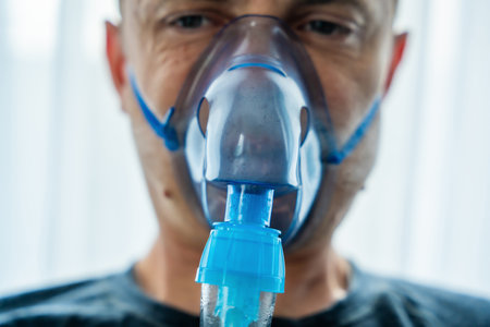 A man with an inhalation mask on his face.