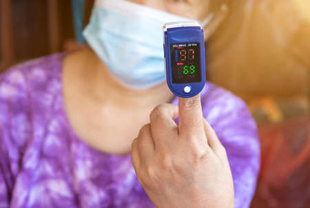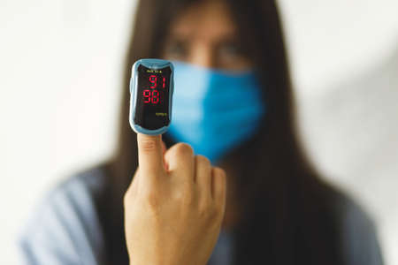 Detecting coronavirus at home, injury lungs and pneumonia by virus.Pulse Oximeter on hand measuring blood oxygen level on background of adult female in face mask.