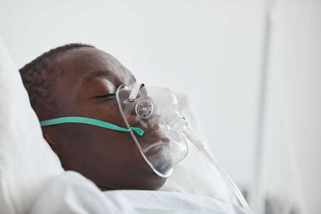 Side view portrait of young African-American man in hospital bed with oxygen mask , copy space