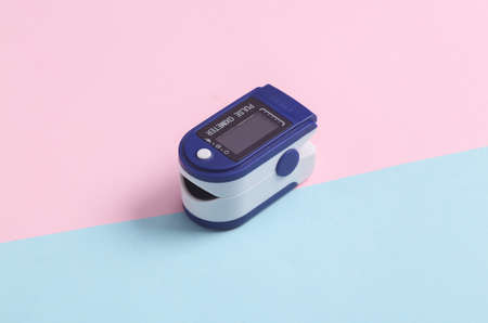 Electronic medical device pulse oximeter on a blue-pink pastel background. Measure the saturation of hemoglobin with oxygen in arterial capillary blood.