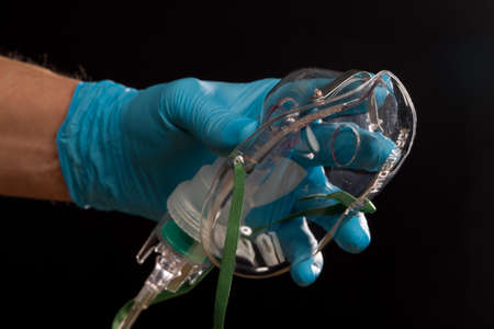 Doctor's hand in medical gloves with disposable oxygen mask for breathing support