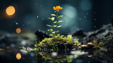 closeup small plant sprouting ground rainy background resources radiate connection new dawn darkness profile connecting life growing off tree banner protection, generative ai
