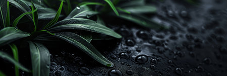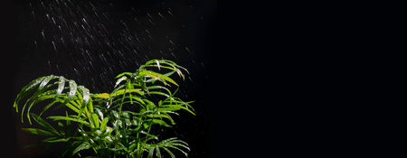 Home palm, houseplant juicy bright green leaves on a black background with pouring drops of water, banner for text