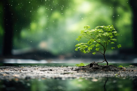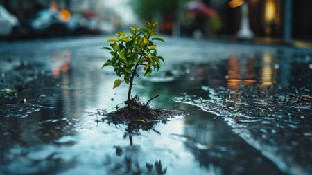 A young plant is growing vigorously out of a puddle of water, showing natures resilience in an urban environment. Eco-friendly and sustainable urban development concept.