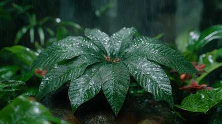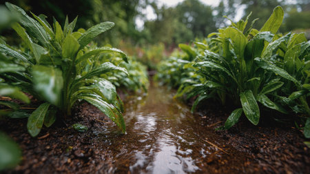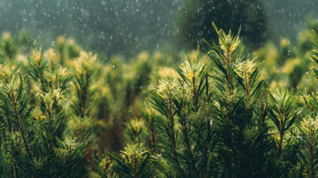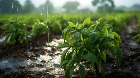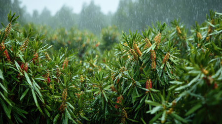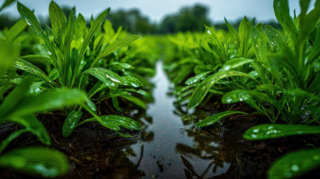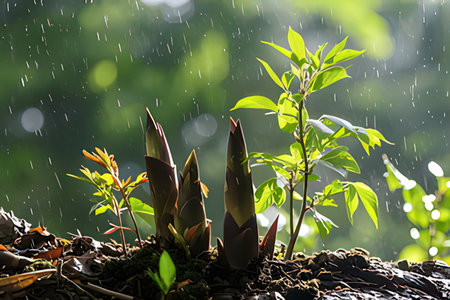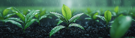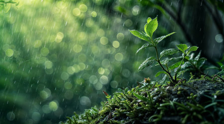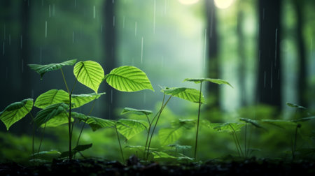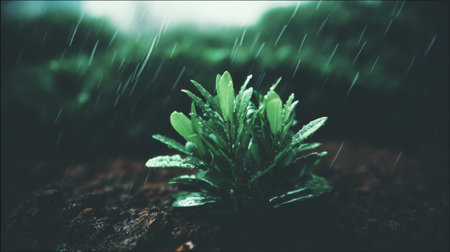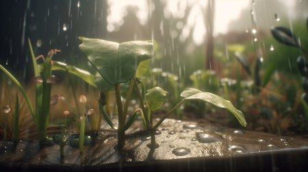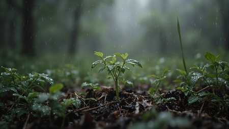 An AI illustration of An AI generated illustration of A vibrant landscape featuring lush green foliage sprouting from the ground in a rainfall setting