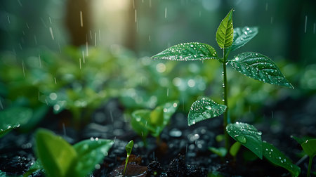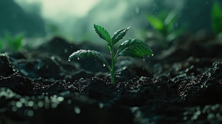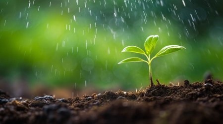 A vibrant green seedling emerges from rich, dark soil, glistening with raindrops under a gentle rainfall. capturing concepts of growth, renewal, and the natural cycle of life, this scene embodies the essence of rebirth and vitality. Generative AI