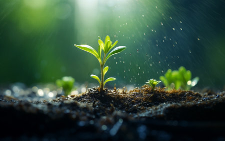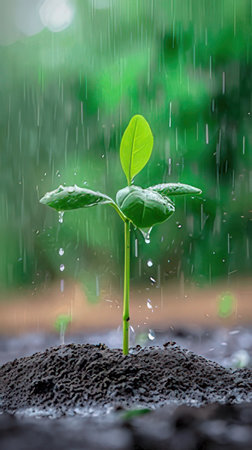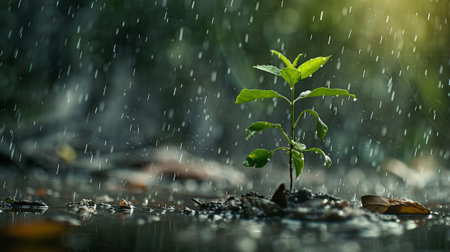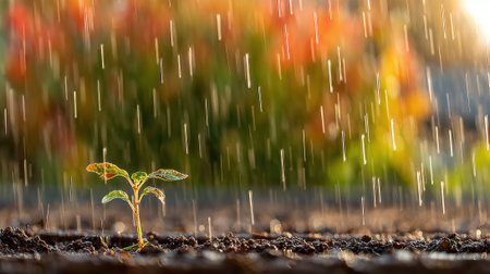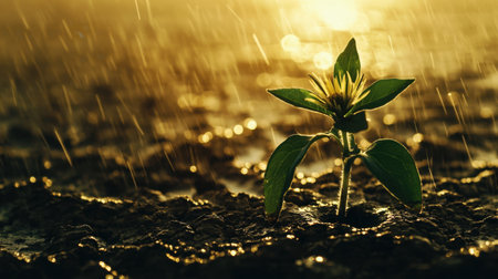 A young plant breaks through the wet soil under a soft sunrise, representing growth and resilience in nature's beauty, as raindrops cascade gracefully around it.