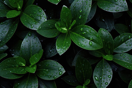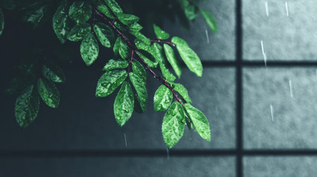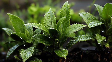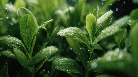 Captivating close-up of fresh green leaves adorned with raindrops, illustrating the beauty of nature in a serene atmosphere during a rainy season.