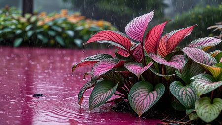 Beautiful red and green leaves of a tropical plant getting wet under the rain with a magenta pond in the background. Ai generated image