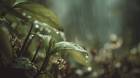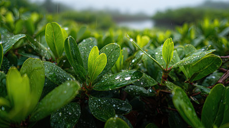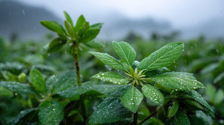 Fresh green leaves adorned with shimmering water droplets create a serene atmosphere in a misty landscape during rainfall. This imagery showcases the beauty of nature's resilience and vitality.