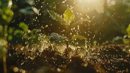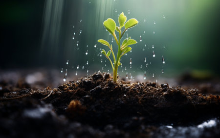 A lush green plant sprouting from the soil, with droplets of water clinging to the leaves, symbolizing nourishment.