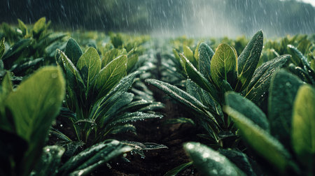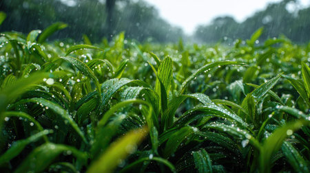 A panoramic wide view of field growing closely together under light drizzle soft raindrops on leaves ultra realistic photography natural daylight cinematic wide composition lifelike natural scene
