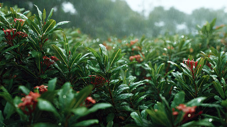 A panoramic wide view of Ixora field growing closely together under light drizzle soft raindrops on leaves ultra realistic photography natural daylight cinematic wide composition lifelike natural scene