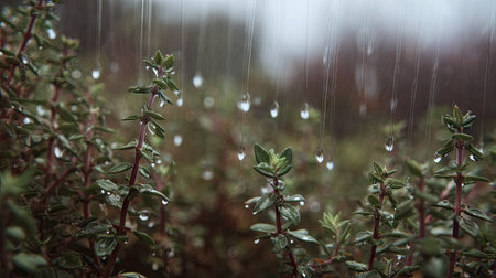 Soft rain falling gently on Thyme, with water droplets forming and slowly dripping. The background is softly blurred with a natural, moody atmosphere.