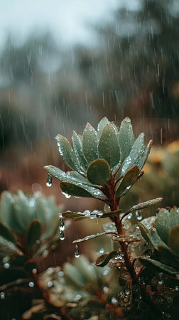 Soft rain falling gently on Shiny bush, with water droplets forming and slowly dripping. The background is softly blurred with a natural, moody atmosphere.