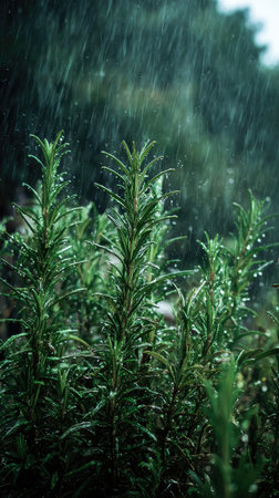 Rosemary in a storm, heavy rain pouring down, strong winds twisting their leaves, natural.