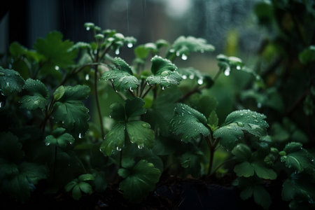 Plants with fresh water drops in garden on a rainy morning in countryside