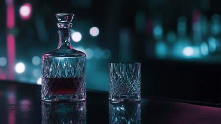 Elegant crystal decanter with whiskey and matching glass on a reflective bar counter. Luxury nightlife and fine spirits concept