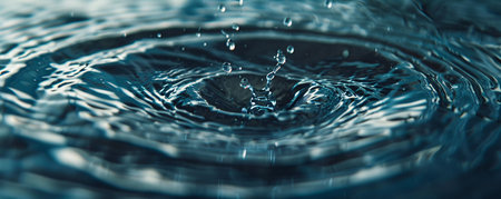 Water droplet creating ripples on a reflective surface, close-up view. Serenity and nature concept