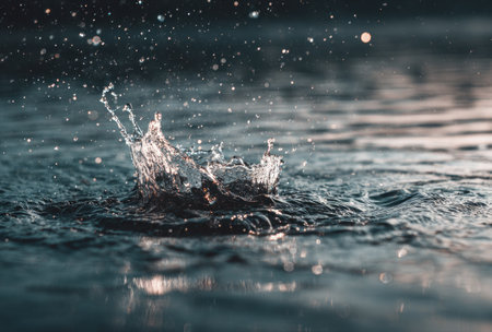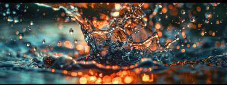 A dramatic capture of a water splash with warm lighting and a beautiful bokeh effect, highlighting the motion and energy of the droplets in an artistic manner.