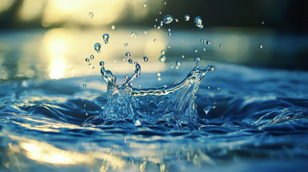 A stunning close-up of a water droplet creating ripples on a serene water surface during sunset. The mesmerizing beauty showcases natures fluid motion and tranquility.