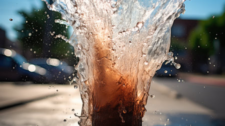 A dramatic close-up of a water splash in motion, with crystal-clear details and light reflections creating a dynamic, refreshing scene.